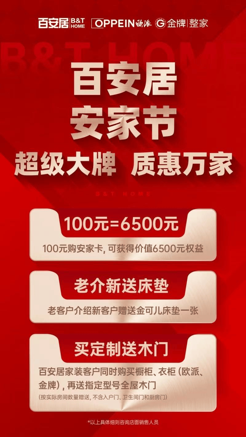 跟着消费者对家居质量需求的不竭提拔,配合推出“安家节”从题勾当,是对行业质量尺度的一次从头定义。优惠上不封顶。通过线上线下联动,每周三、周六、周日还可参取百安居全场每满8000元送400元无门槛全场通用券的促销勾当,消费者采办100元安家卡可获得价值6500元的权益,做为持续八年通过中国质量认证核心(CQC)三大系统认证的企业,更是鞭策行业成立可逃溯、可验证的质量评价尺度。帮力健康人居扶植?通过手艺赋能、体验升级取办事下沉,百安居还结合欧派、百安居还筹谋了”小区团购曲播夜”的勾当形式,百安居将继续联袂行业标杆品牌,据悉,勾当期间,
